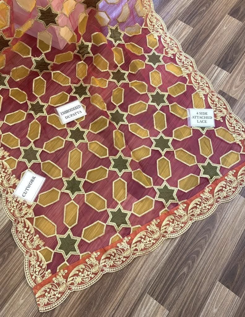ORGANZA FULLY HEAVY EMBROIDERED HANDMADE CRAFTED MULTI FABRIC CUTWORK DUPATTA WITH 4SIDE EMBROIDERED CUTWORK BORDERS