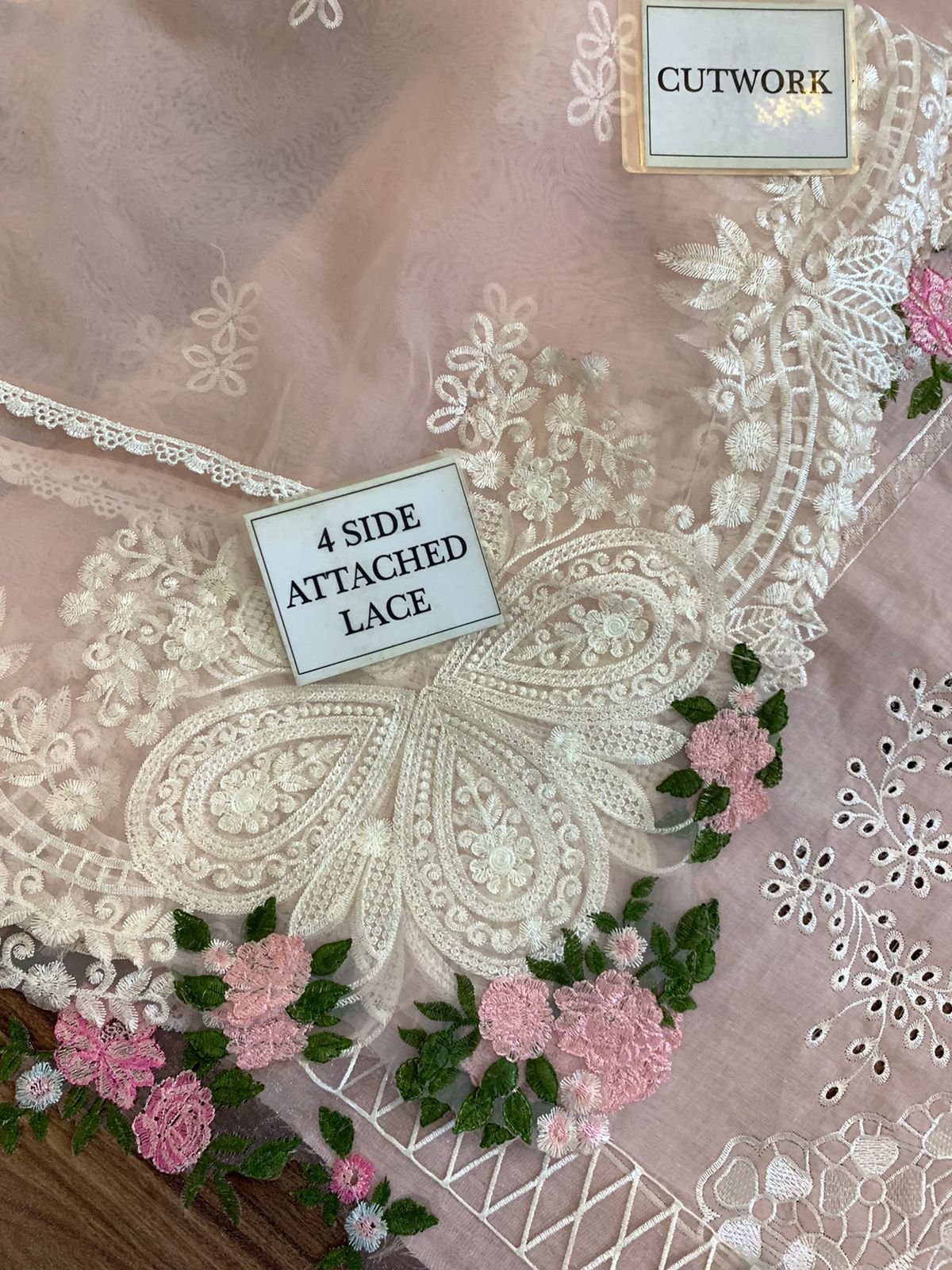 HEAVY EMBROIDERED ORGANZA DUPATTA WITH 2SIDE HEAVY EMBROIDERED CUTWORK ATTACHED LACE AND HEAVY EMBROIDERED CUTWORK PALLU ATTACHED