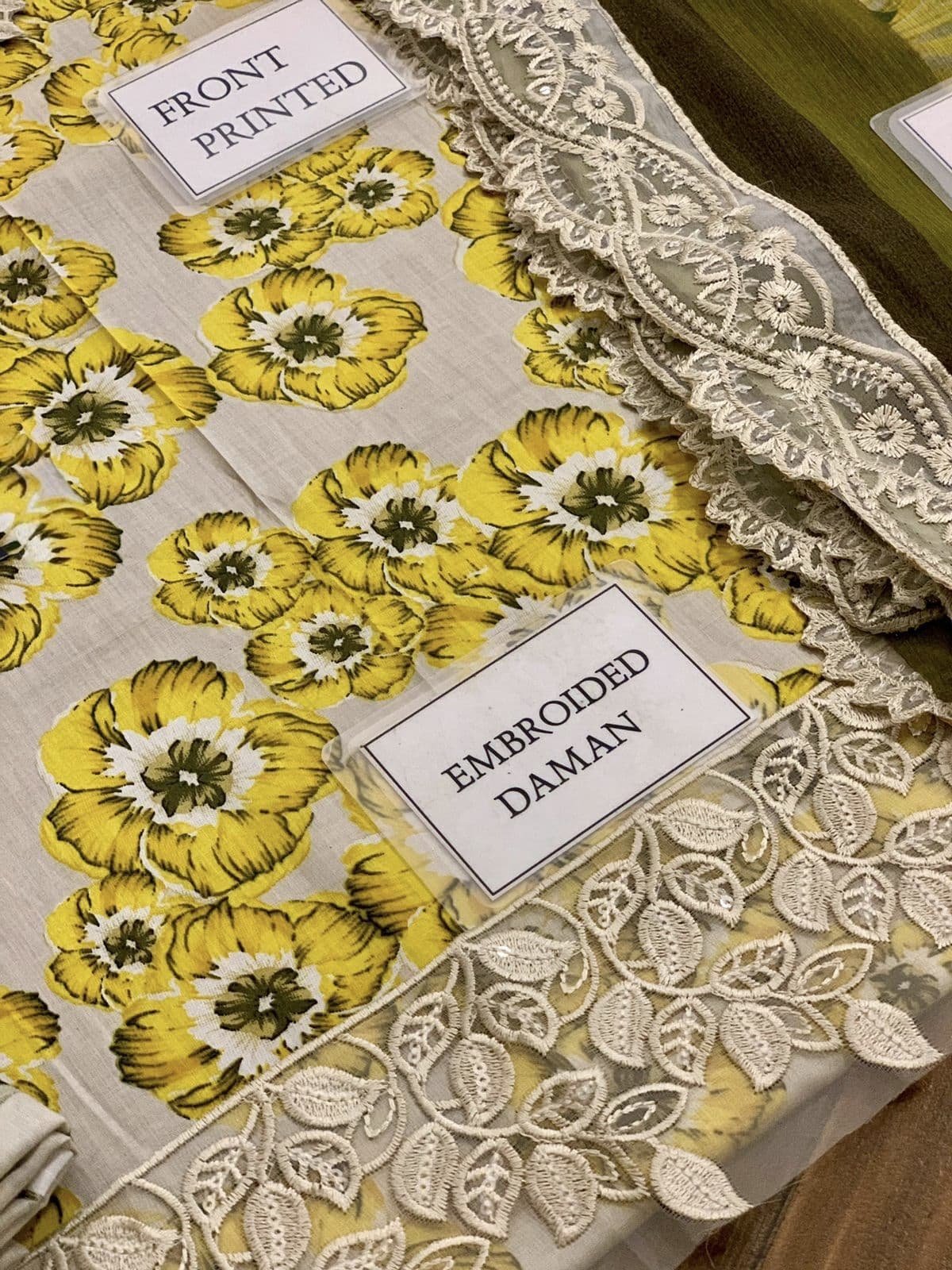Elegant summer Printed Embroidery Lawn Unstitched Yellow Dress