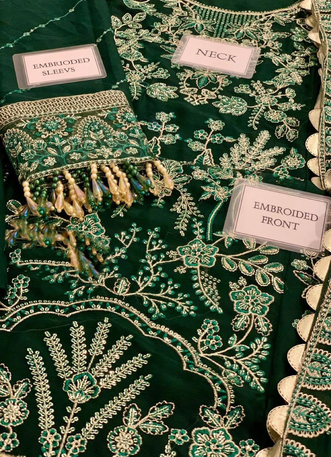 Chiffon fully heavy embroidered spengle work centre panel front with heavy embroidered spengle work left & right panel attach with heavy embroidered spengle work daman boarder with fancy tulses attach