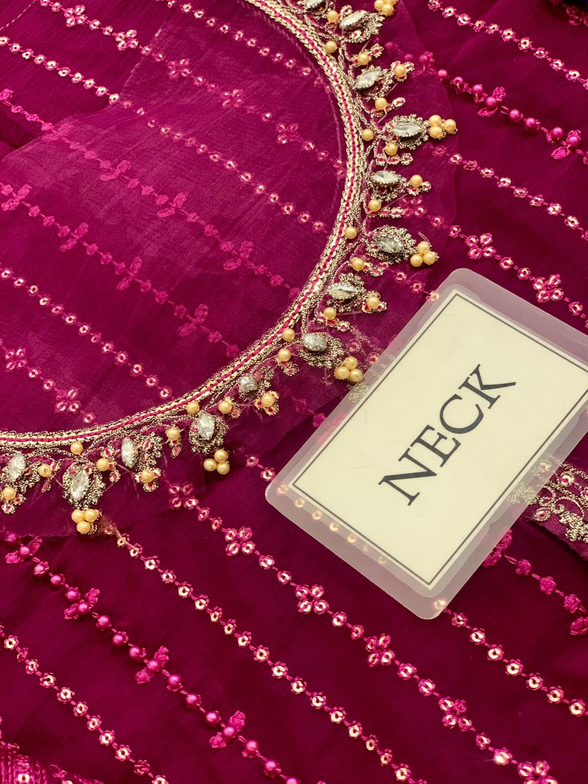chiffon fully heavy embroidered spengle left & right panel with fully hand emblishment adha work with embroidered spengle work neckline with hand emblishment adha work with embroidered spengle work centre panel lace with heavy embroidered spengle work & laser work daman boarder with fancy tulses attach