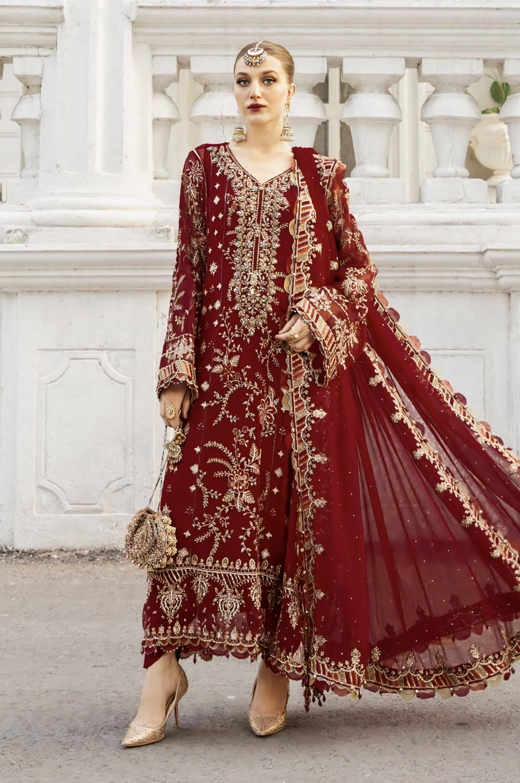 Elegant Luxury Work Unstitched Wedding Partywear Maroon Dress Nikha Walima Engagement Mehndi Mayon Dress