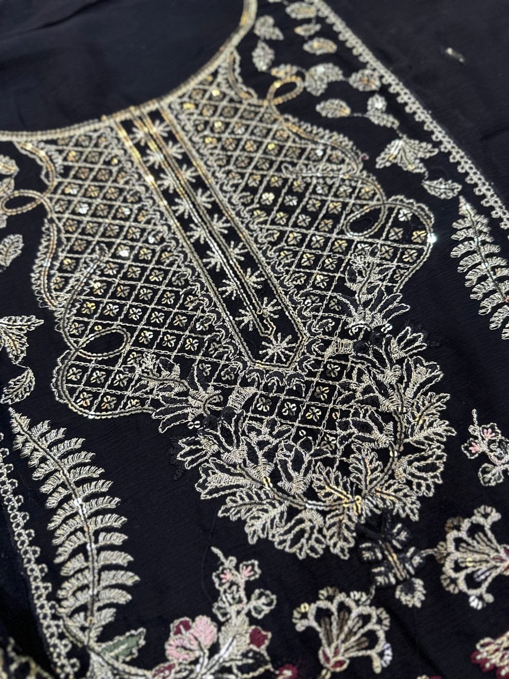 • Front Left & Right Panels: Embroidered & sequinned chiffon.