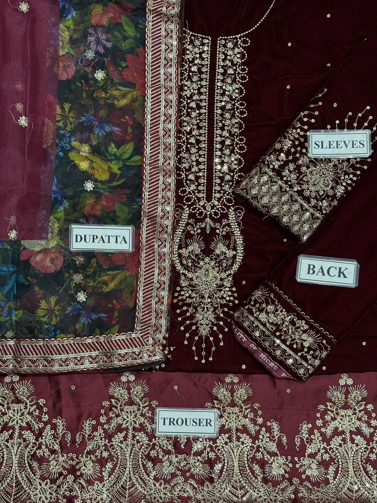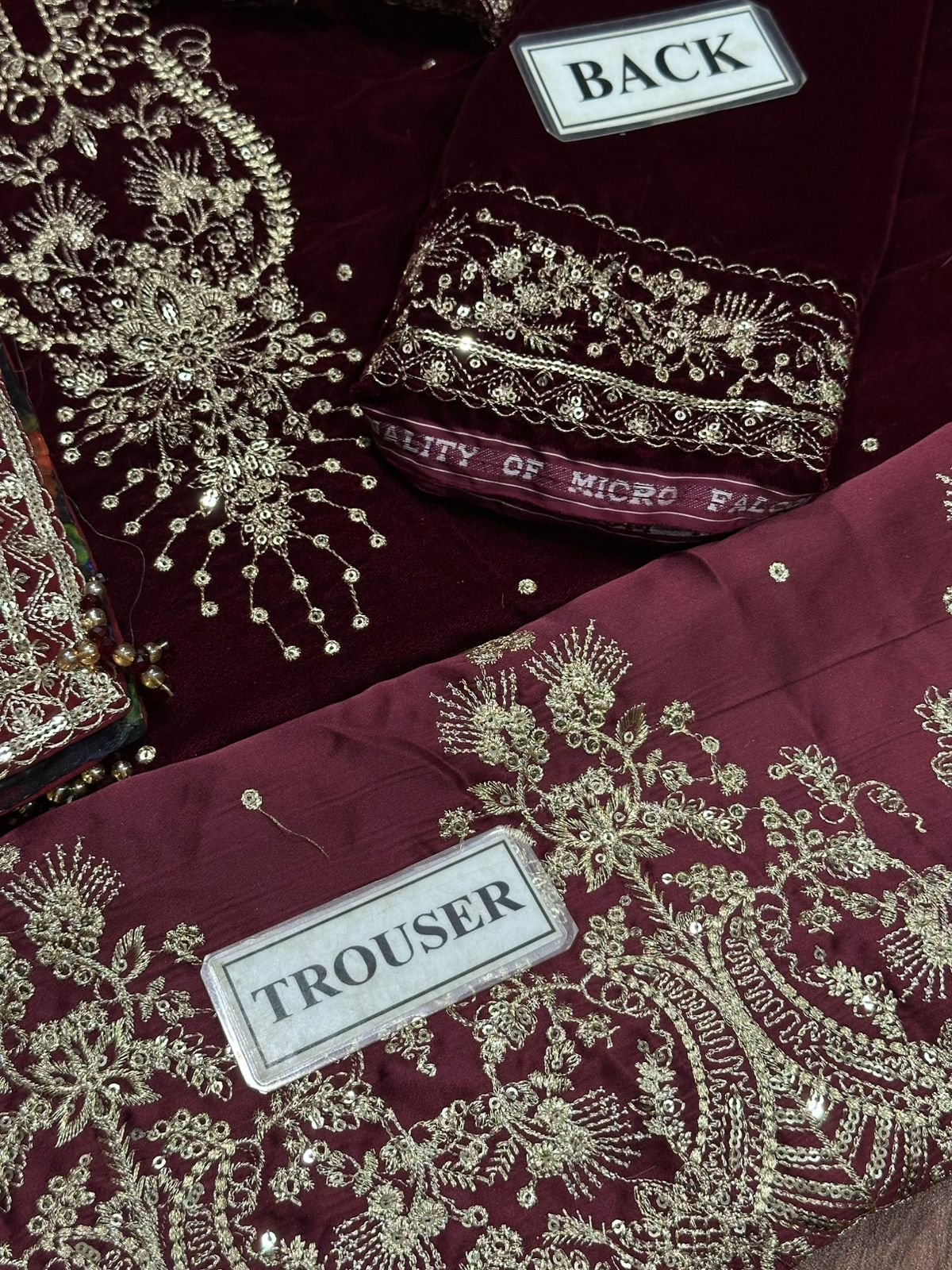 Velvet Elegant Luxury Work Unstitched Wedding Partywear Maroon Winter Dress Nikha Walima Engagement Mehndi Mayon Dress