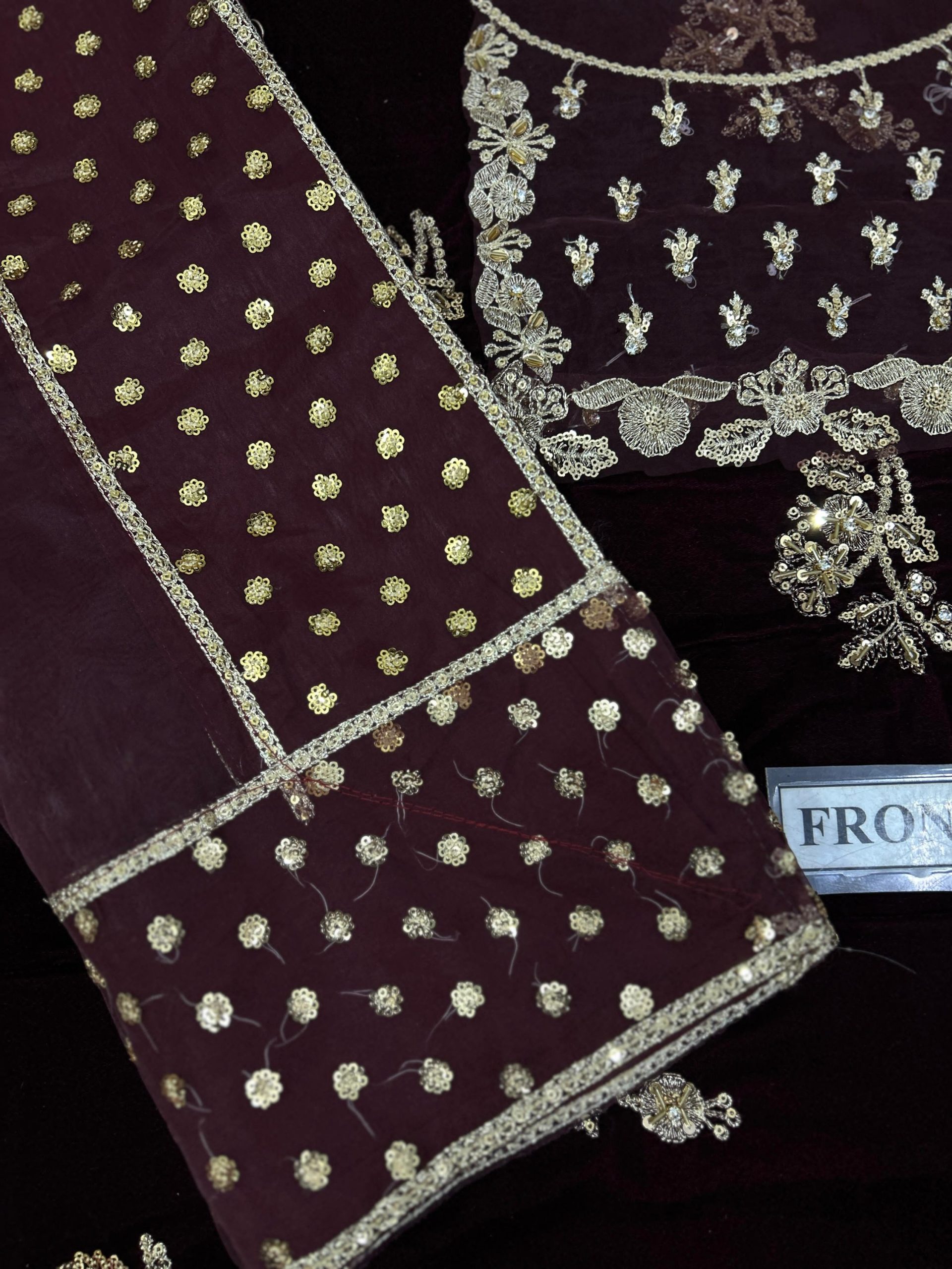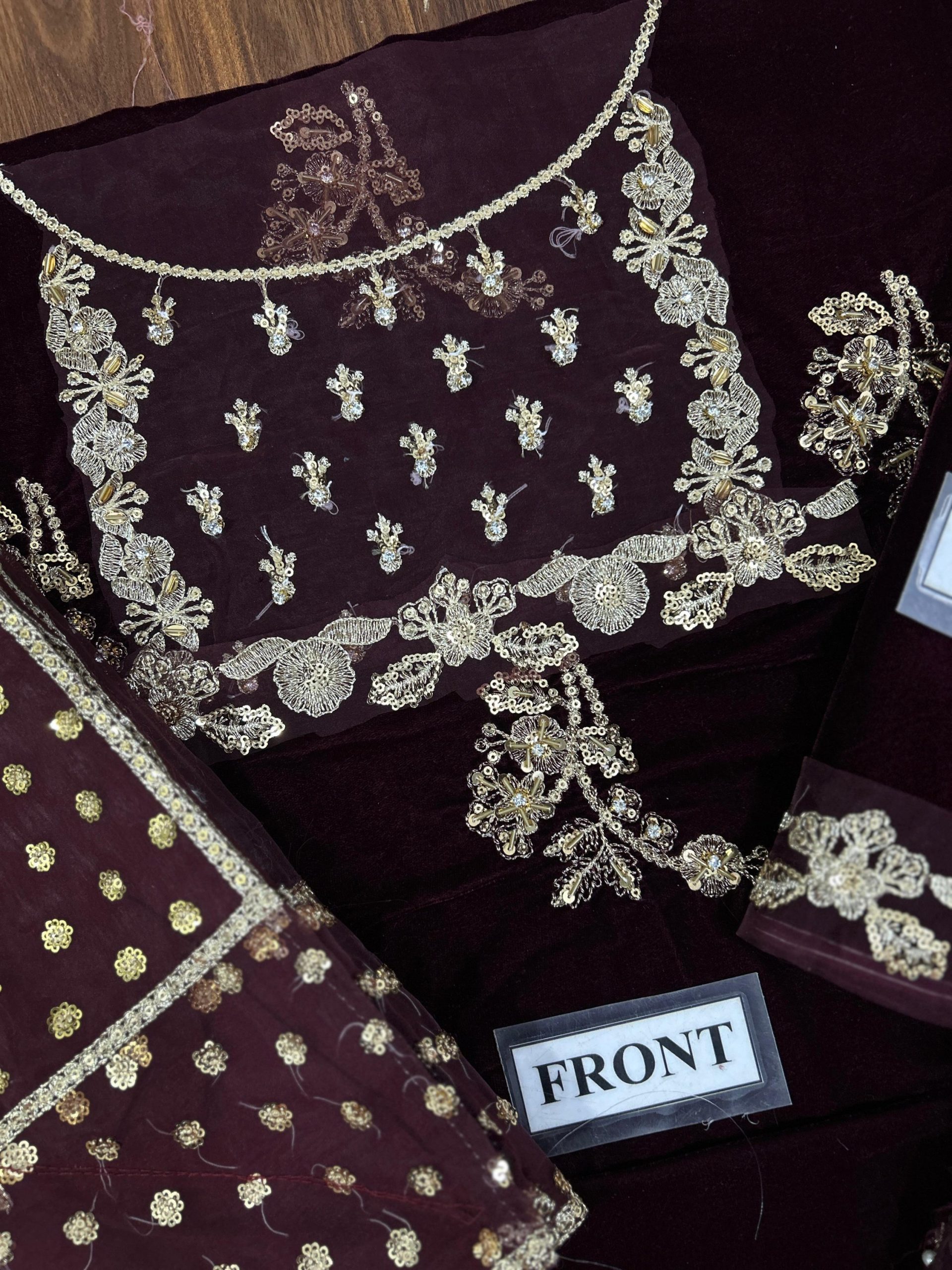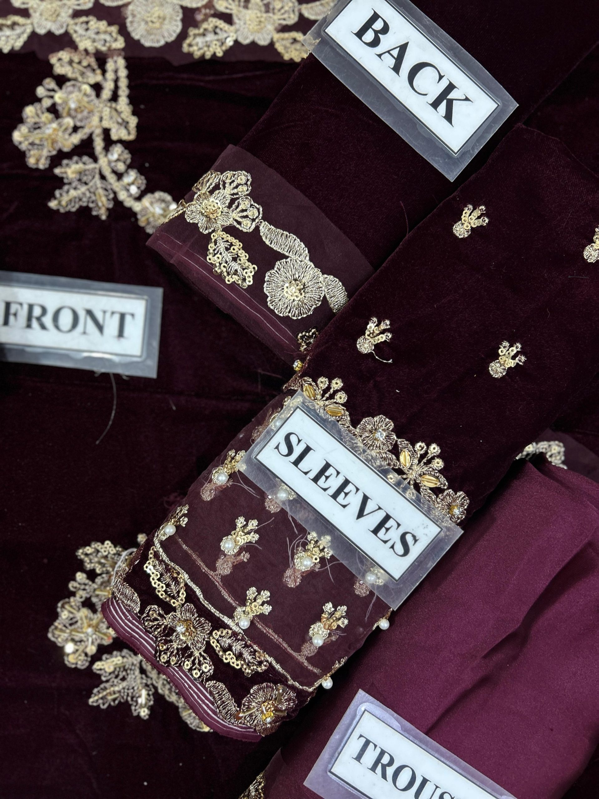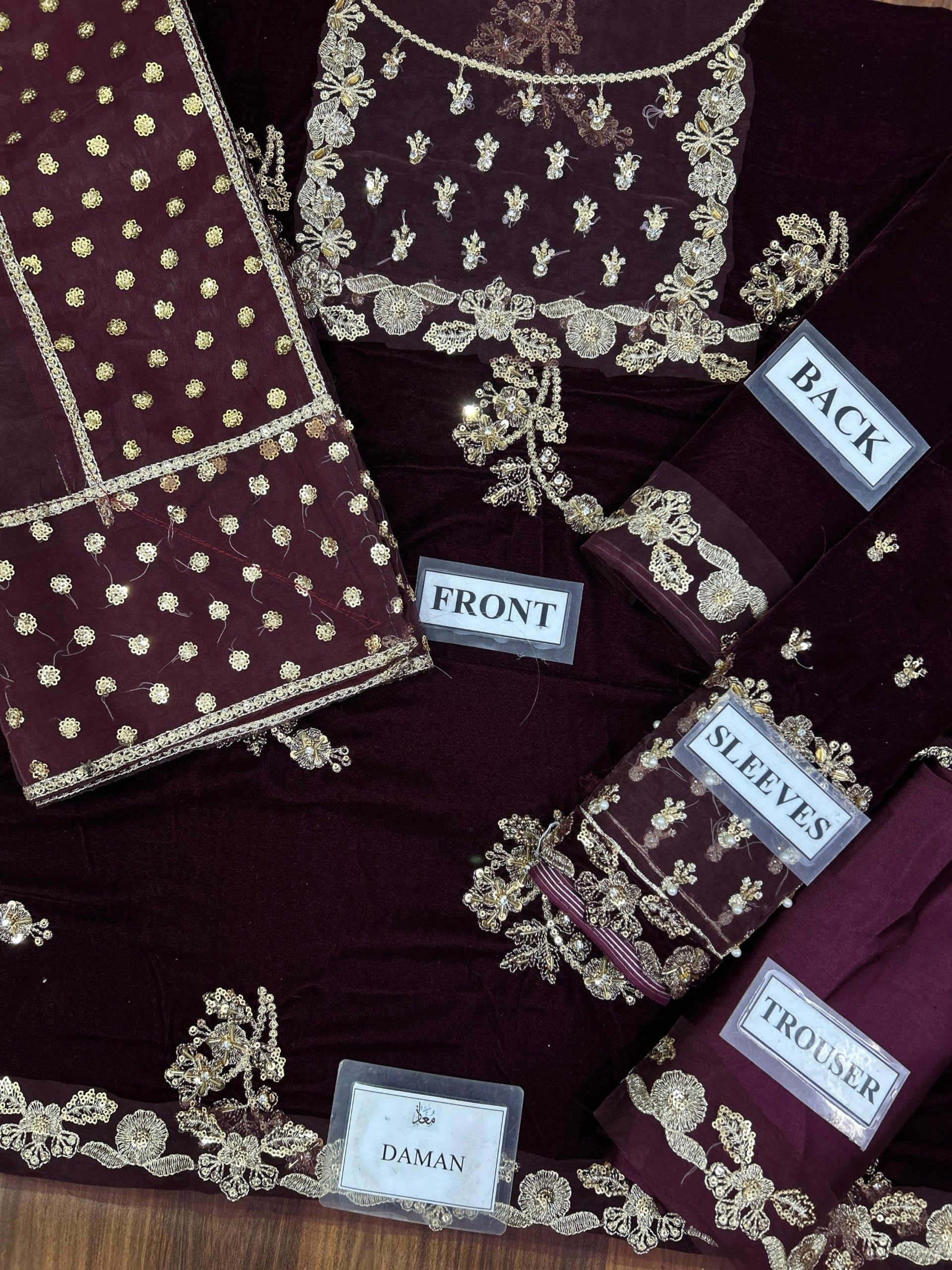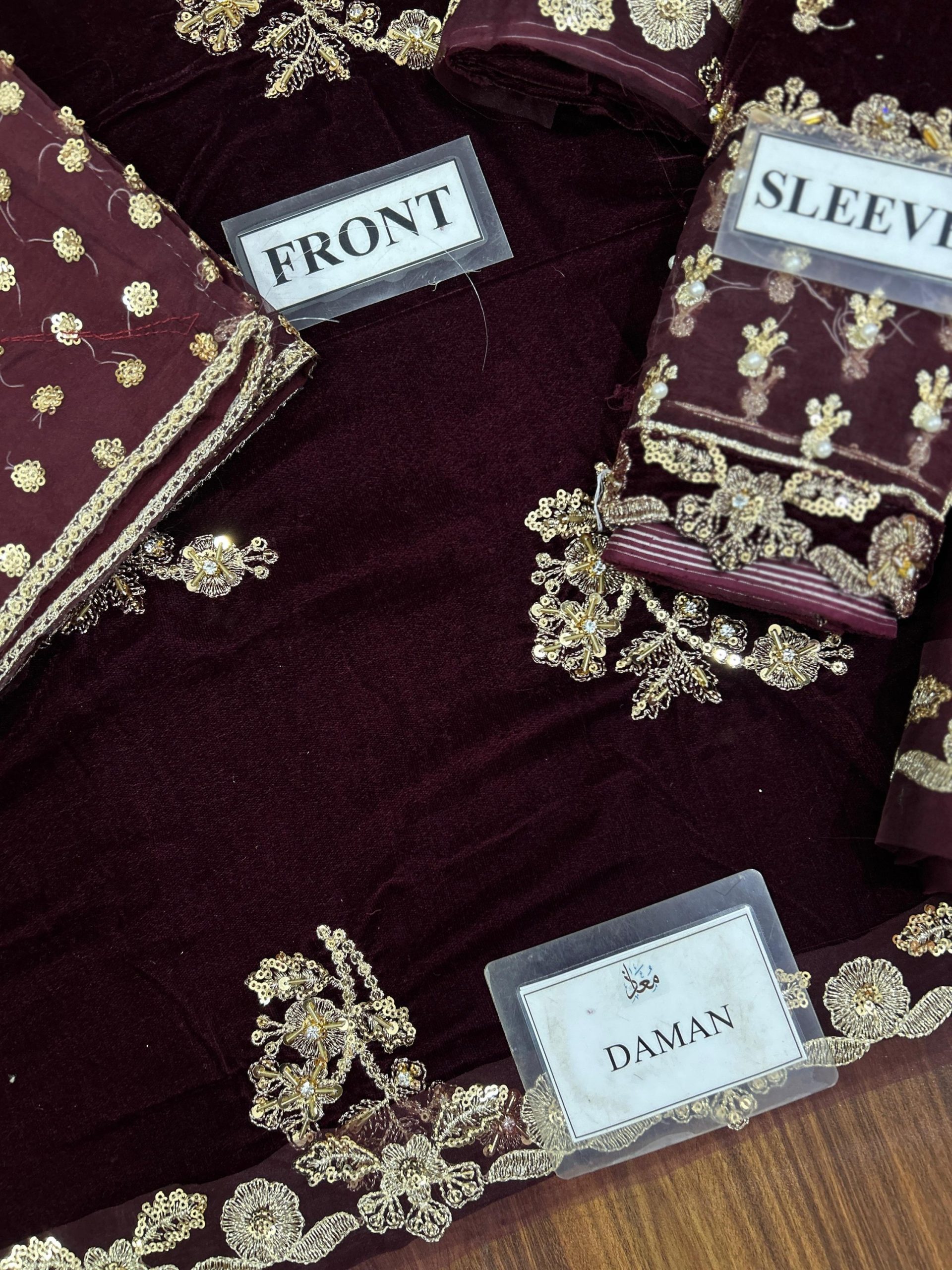 Velvet Elegant Luxury Work Unstitched Wedding Partywear Maroon Winter Maroon Dress Nikha Walima Engagement Mehndi Mayon Dress