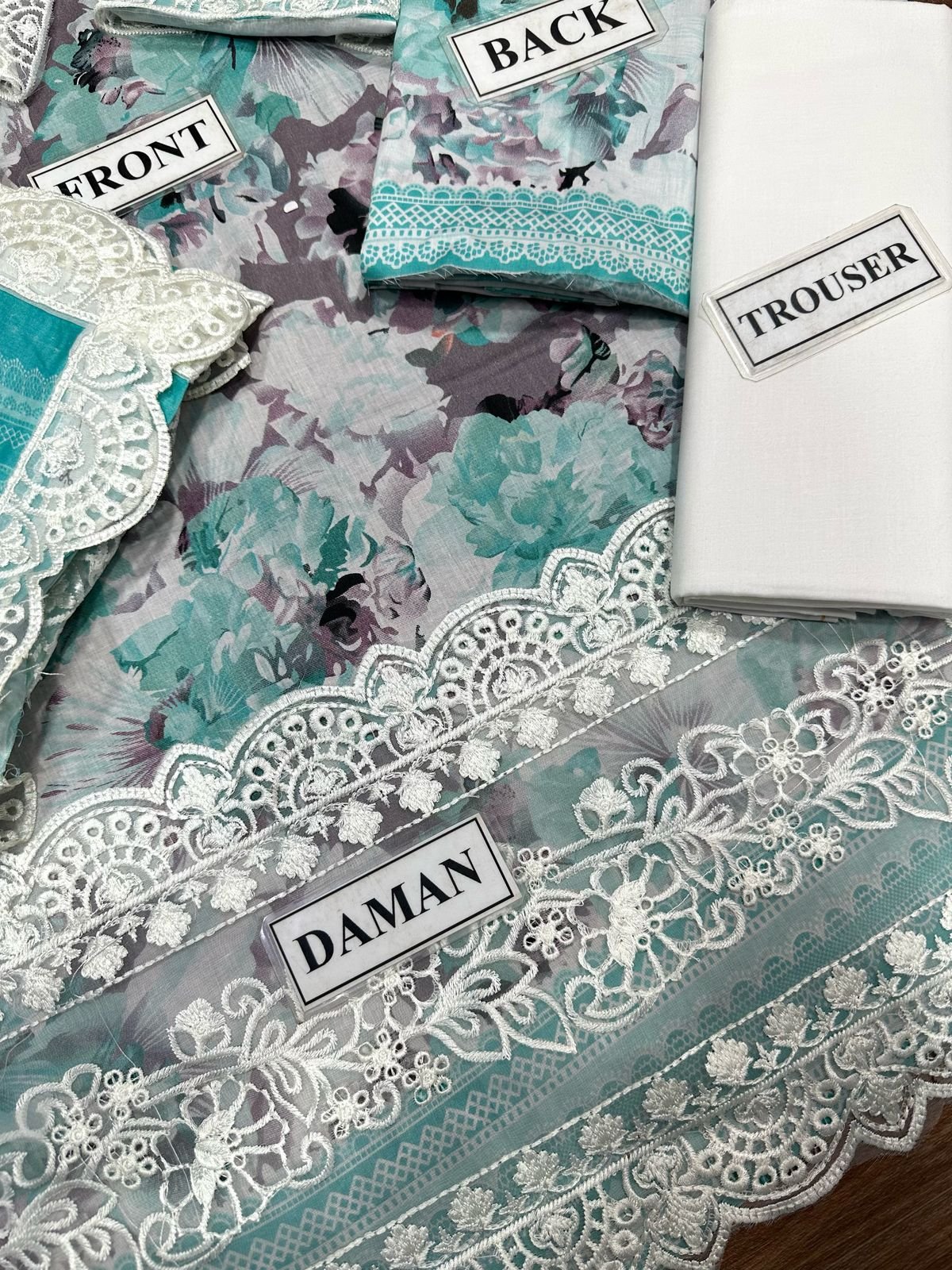 Elegant Summer Printed Embroidery Unstitched Lawn Aqua Dress