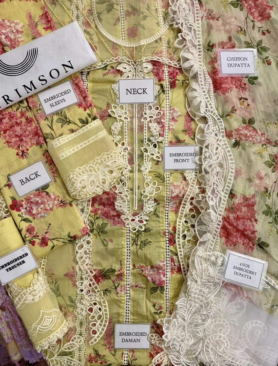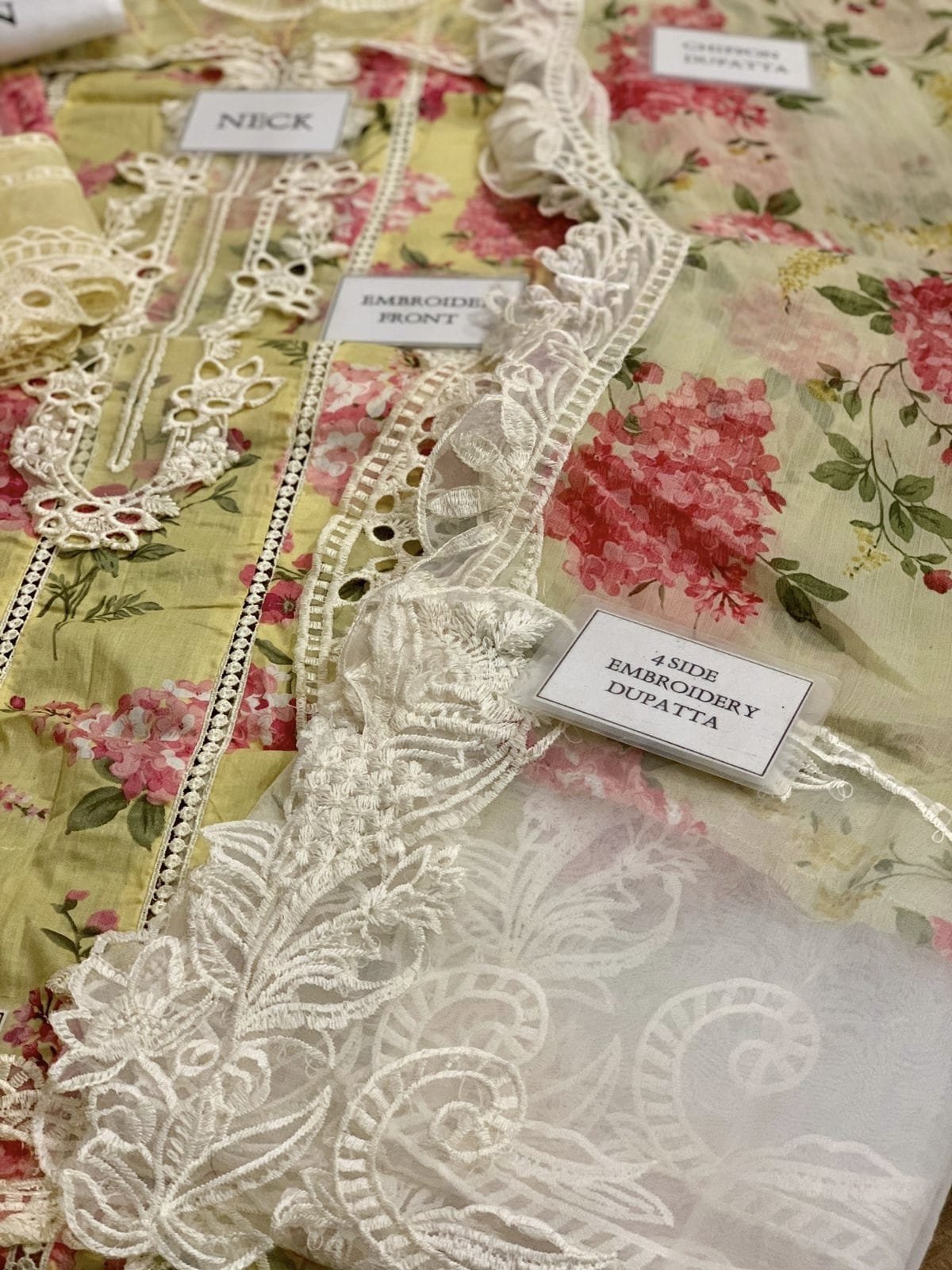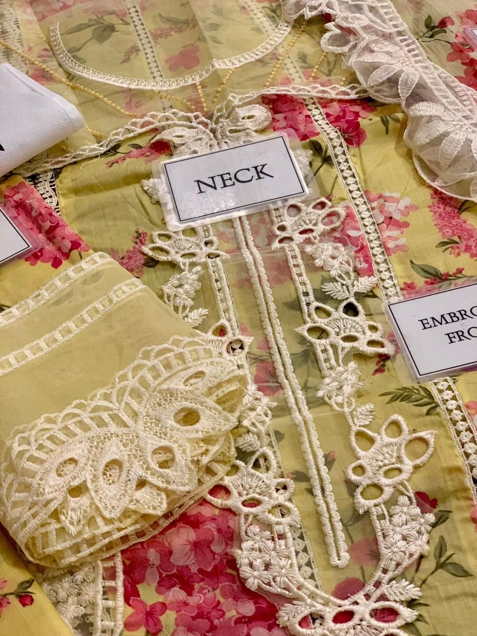 printed lawn front with fully heavy embroidered scifflie lace attach with heavy embroidered scifflie neck line with heavy embroidered scifflie chak and daman bunches