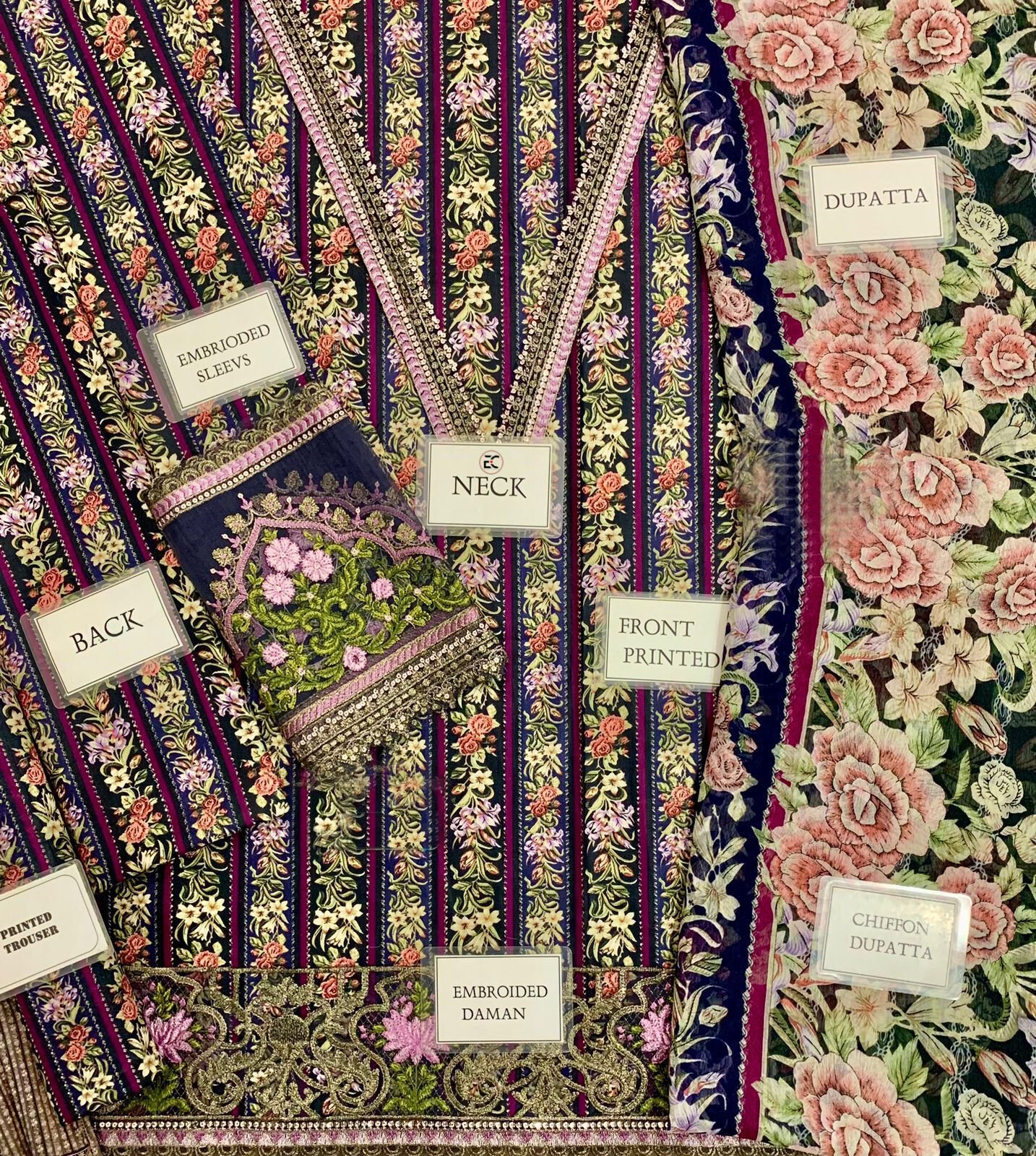 Printed lawn front with heavy embroidered spengle work neckline with heavy embroidered spengle work daman boarder with cut work