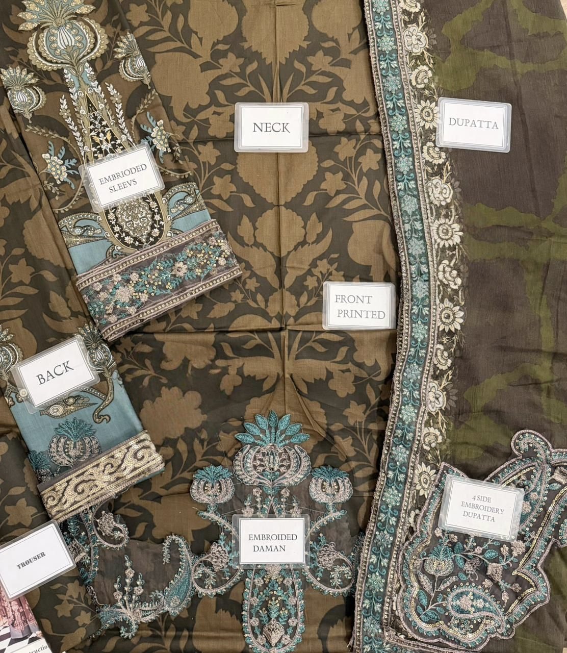 printed lawn with fully heavy embroidered spengle work daman boarder with embroidered spengle work neckline