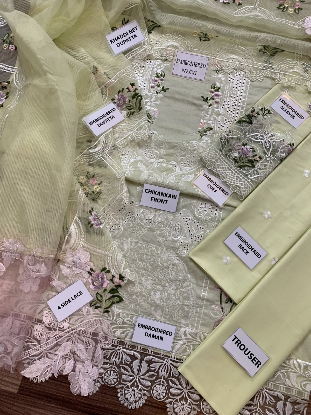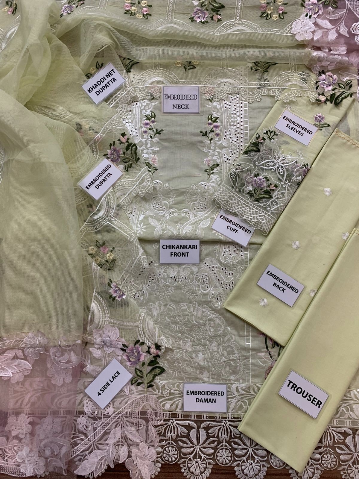COTTON DYED TROUSERORGANZA FULLY HEAVY EMBROIDERED DUPATTA WITH 2SIDE RUNNING CUTWORK BORDERS EMBELISH WITH HEAVY EMBROIDERED CONTRAST CUTWORK PALLU ATTACHED