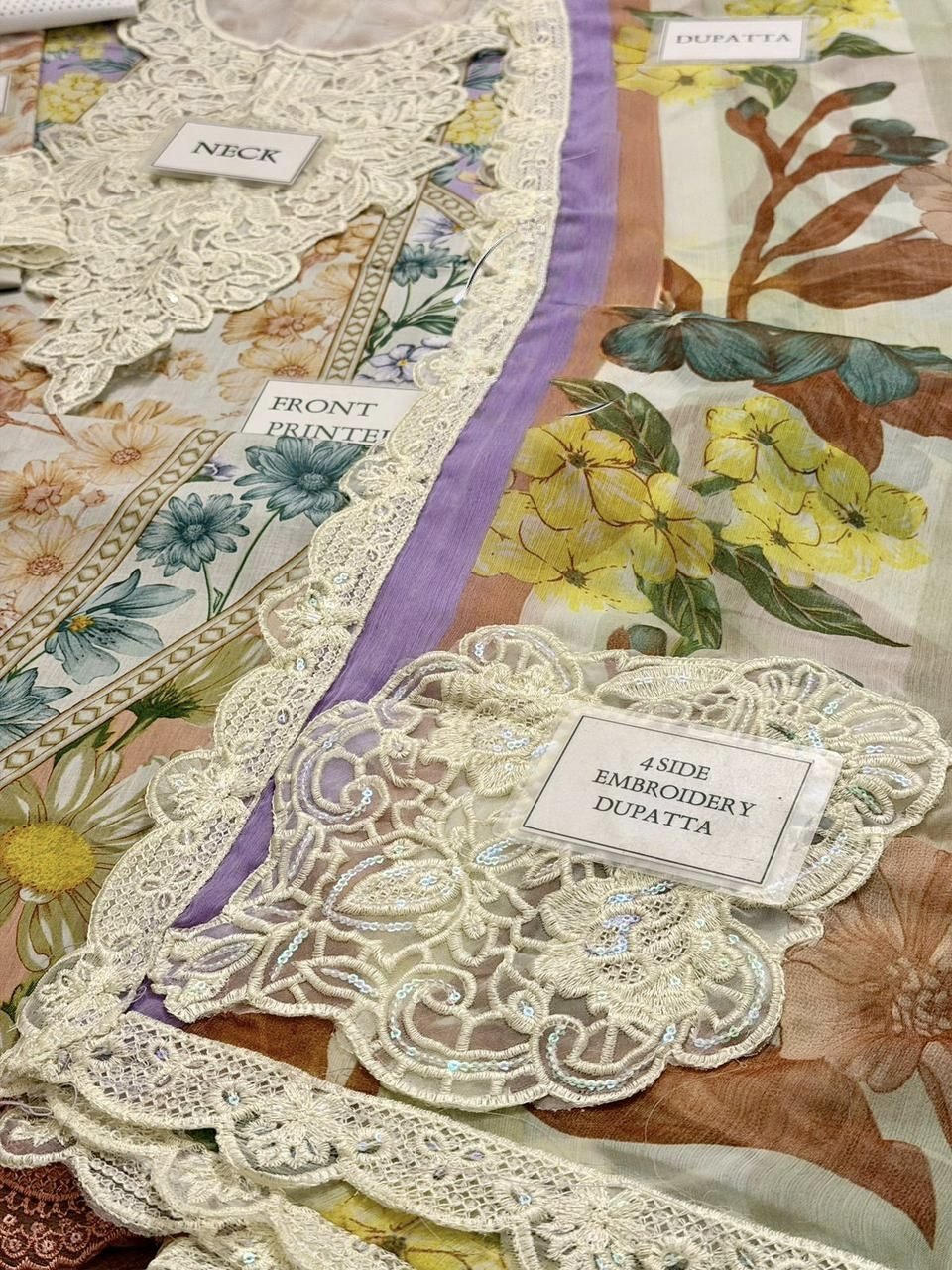 - Printed chiffon dupatta with 4 side heavy embroidered spengle work duphta boarder with 4 side heavy embroidered spengle work duphta bunches attached