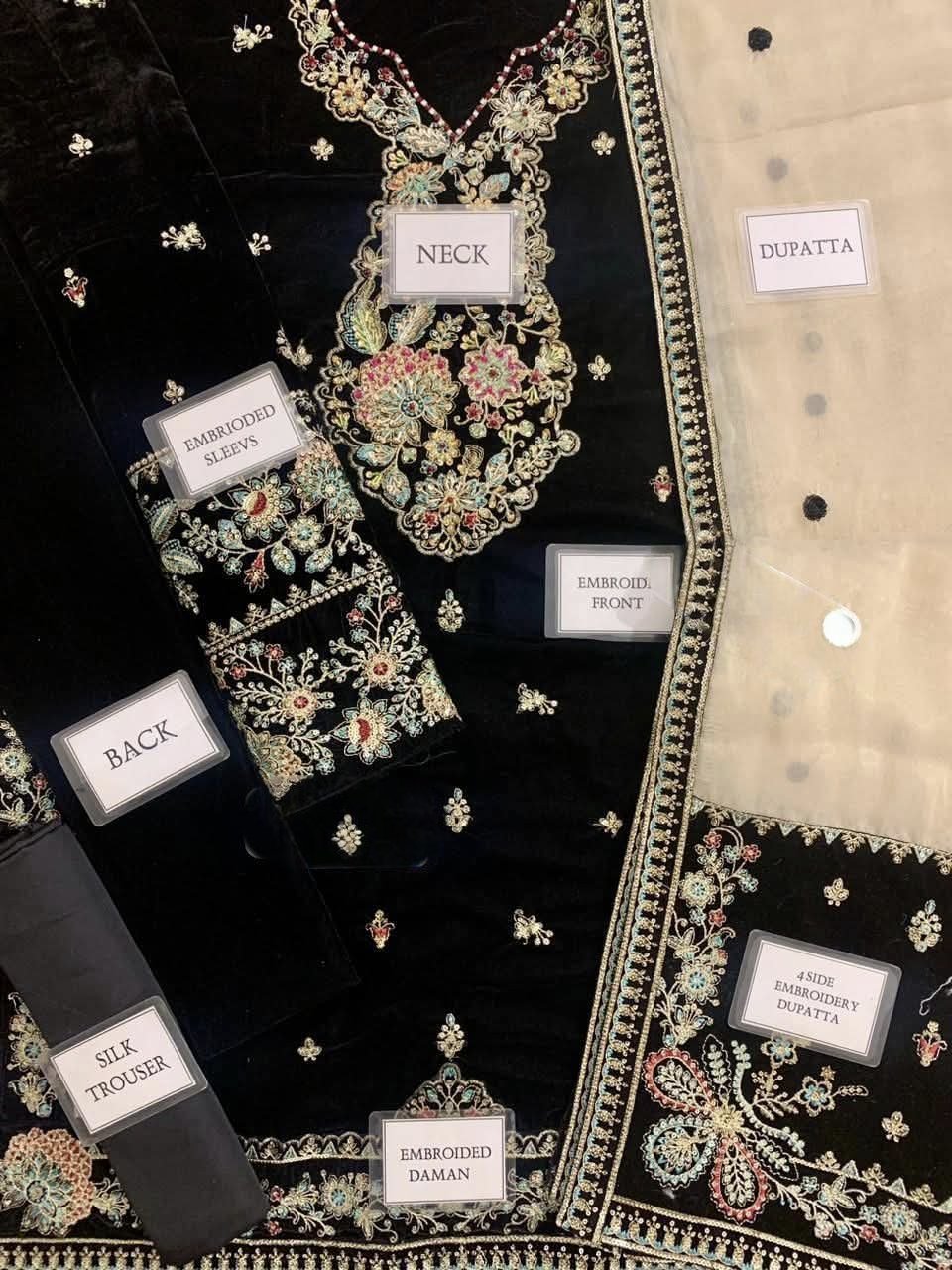 velvet fully heavy alternet embroidered spengle work front with fully hand emblishment adha work neckline with velvet fully heavy embroidered spengle work daman boarder & chak boarder & chak lace