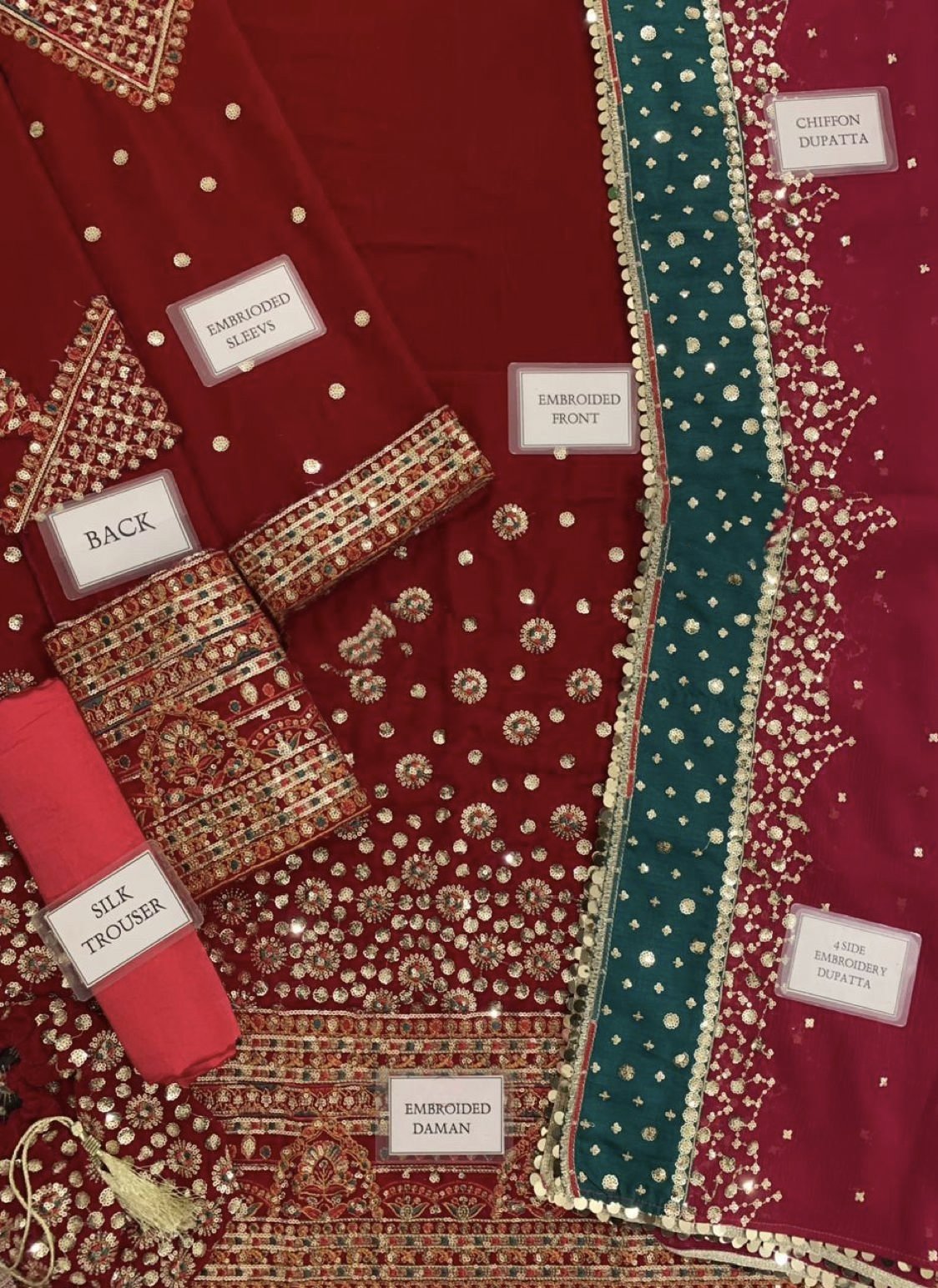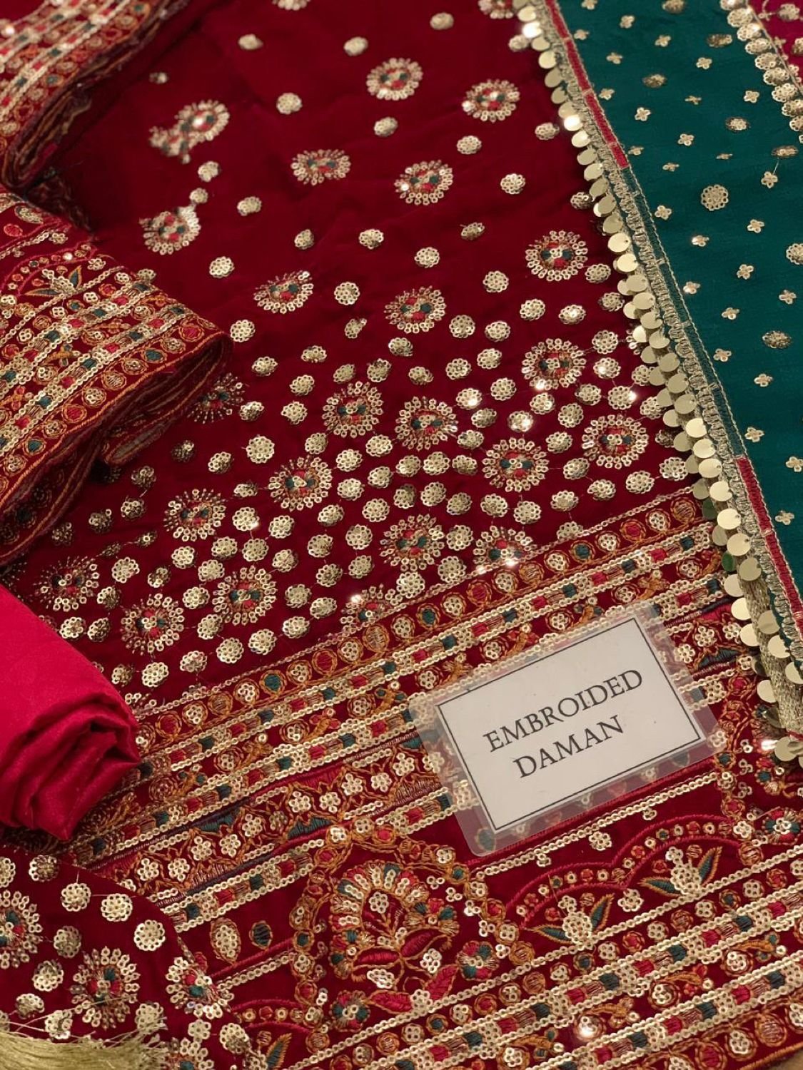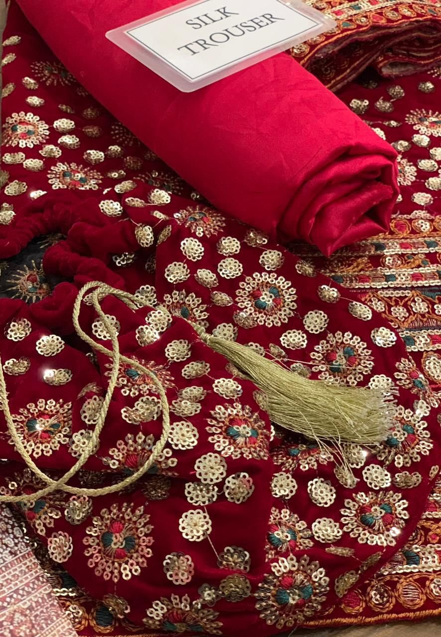 Velvet Elegant Luxury Work Unstitched Wedding Partywear Winter Red Dress Nikha Walima Engagement Mehndi Mayon Dress