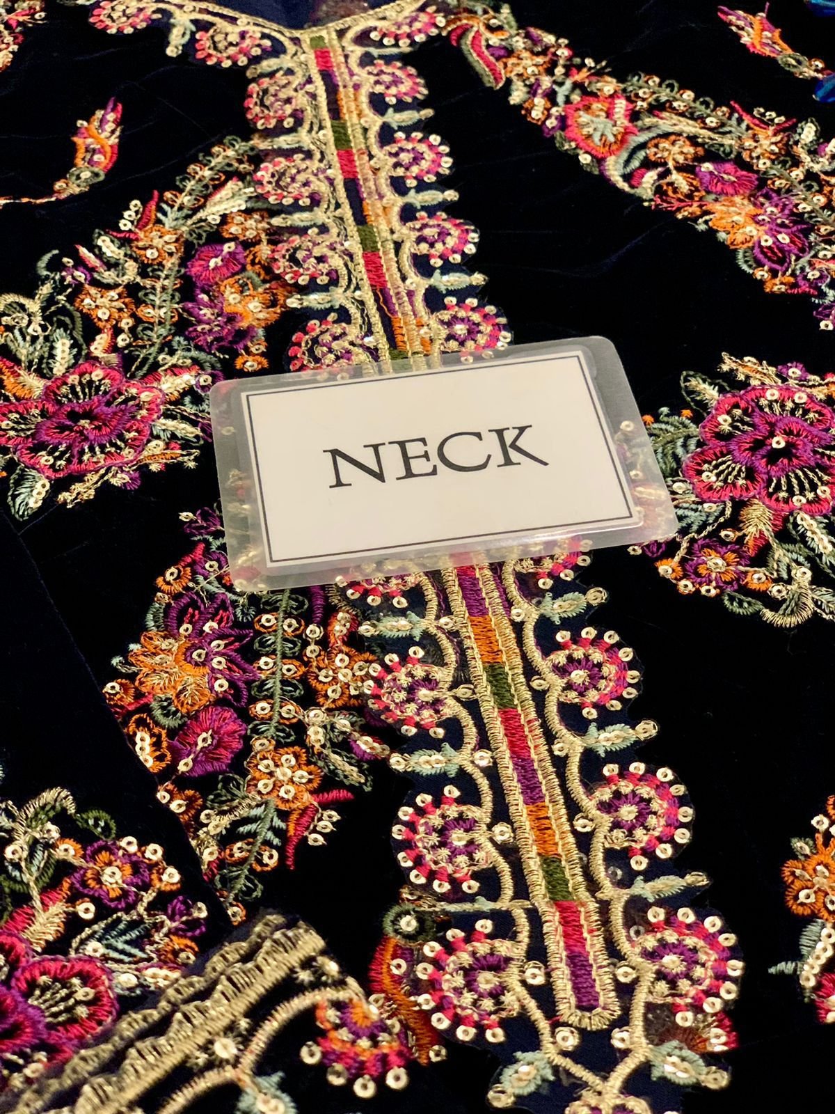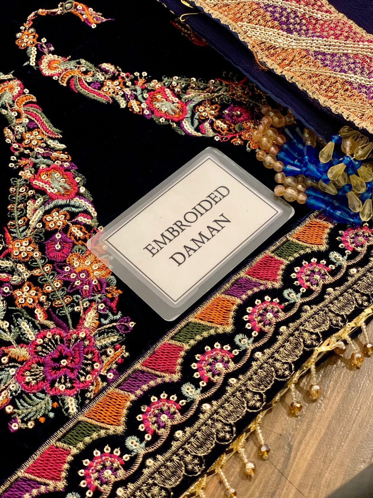 Velvet fully heavy embroidered spengle work front with embroidered spengle work neckilne with velvet heavy embroidered spengle work daman boarder with fancy daman tulses lace attach
